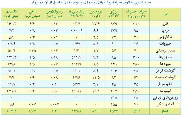 بر اساس این جدول، سرانه مصرف خوراکی ها و آشامیدنی های مورد نیاز یک نفر در روز یک کیلو و ۵۶۳ گرم، انرژی مورد نیاز هر فرد در روز ۲ هزار و ۵۷۳ کالری، پروتیین روزانه حدود ۸۴ گرم، ویتامین A به میزان ۸۴۹.۸ میکرو گرم، ویتامین ب۲ به میزان ۱.۳، آهن مورد نیاز روزانه ۱۵.۷ میلی گرم و کلسیم روزانه یک نفر نیز ۸۰۳.۸ میلی گرم برآورد شده است.