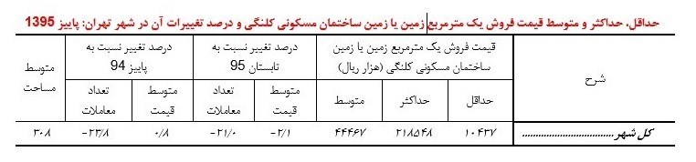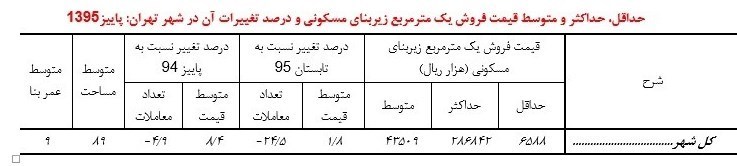 متوسط قیمت فروش هر مترمربع زیربنای مسکونیمعامله شده از طریق بنگاههای معاملات ملکی در شهر تهران 43509 هزار ریال با میانگین مساحت 89 مترمربع و متوسط عمر بنای 9سال بوده است که نسبت به فصل قبل 1.8 درصد و نسبت به فصل مشابه سال قبل 8.4درصد، افزایش داشته است.