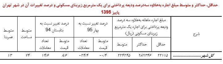 متوسط مبلغ اجاره ماهانه بهعلاوه سه درصد ودیعه پرداختی برای اجاره یک مترمربع زیربنای مسکونی معامله شده از طریق بنگاههای معاملات ملکی در شهر تهران 224245 ریال با میانگین مساحت 74 مترمربع و متوسط عمر بنای 13 سال بوده است که نسبت به فصل قبل0.4 درصد کاهش و نسبت به فصل مشابه سال قبل 8.6 درصد، افزایش داشته است.