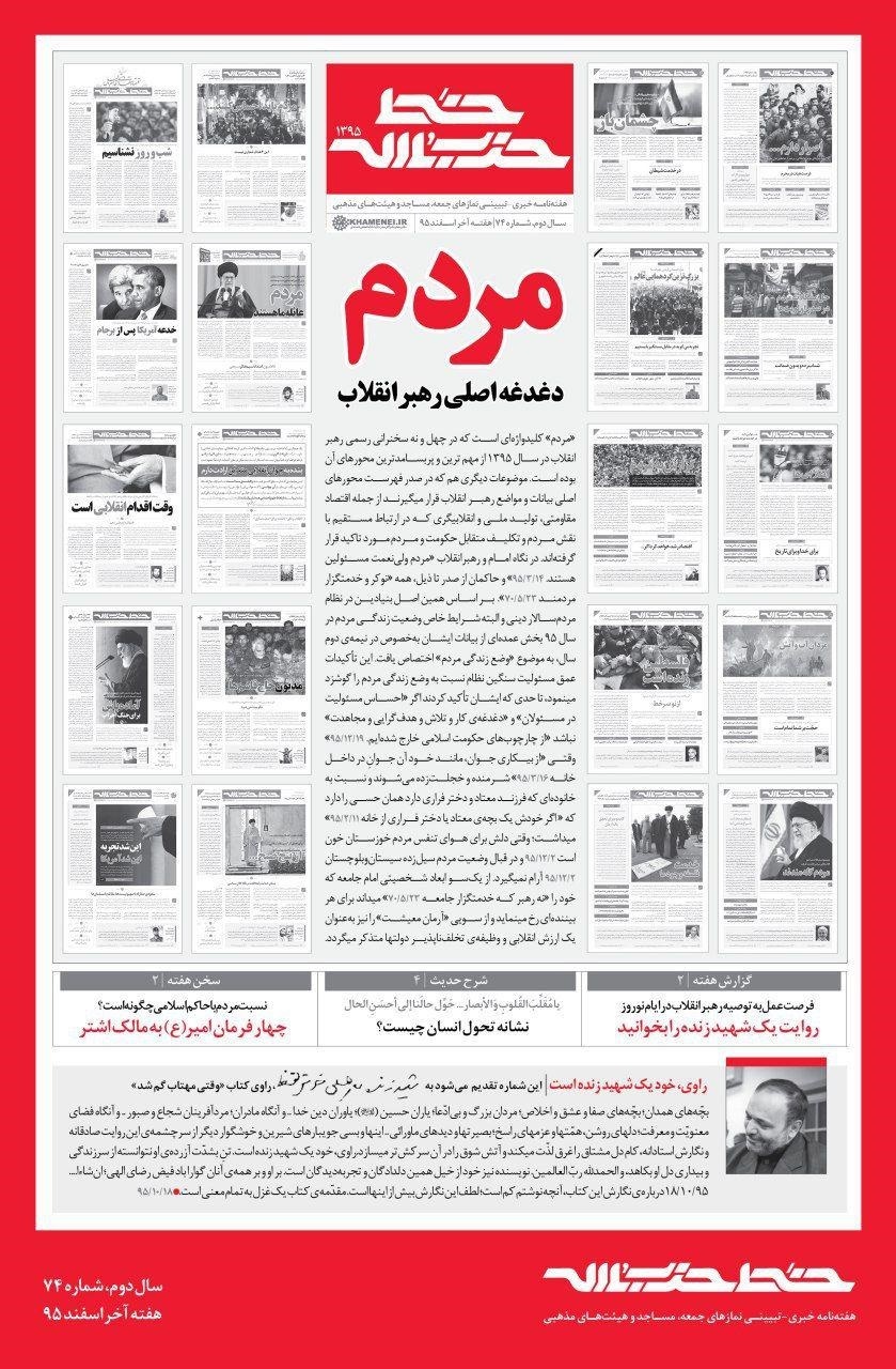کانال تلگرامی Khamenei_ir نوشت: هفتاد و چهارمین شماره خط حزب الله با موضوعات مردم دغدغه اصلی رهبرانقلاب، روایت یک شهید زنده و چهار فرمان امیرالمومنین به مالک اشتر منتشر شد.