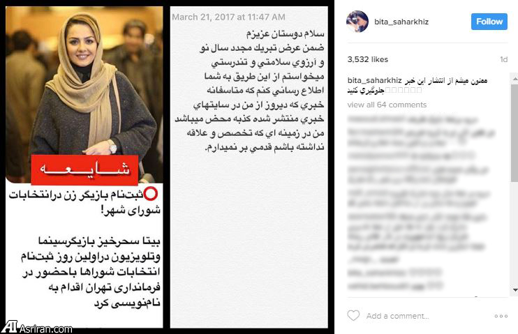 بیتا سحر خیز بازیگر تلویزیون با انتشار پستی در اینستاگرام، ثبت نام خود در انتخابات ش.رای شهر را رد کرد.