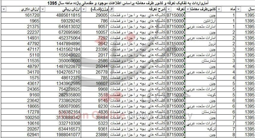 در یازده ماهه نخست سال 95، بیش از 443 تُن کالسکه بچه و اجزای آن از کشورهای مختلف جهان وارد ایران شده است.
