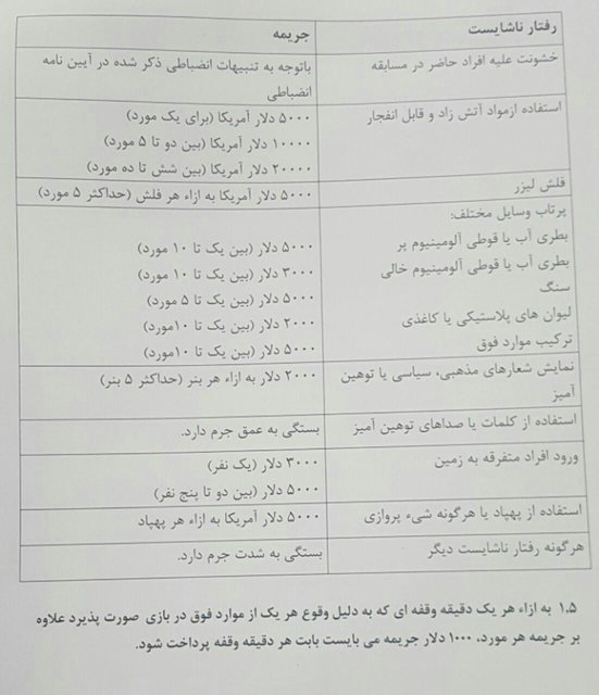تاج ادامه داد: نمایش شعارهای خاص و رفتن به سمت شعار نژادپرستانه هم وجود دارد. ما شعار نژادپرستانه نداریم ولی بقیه موارد شامل ما می‌شود. ورود افراد غیرمسئول به زمین هم جریمه دارد. هر نفر ۵ هزار دلار جریمه دارد. برخی فکر می‌کنند برای انداختن یک عکس می‌توانند وارد زمین شوند. سخت‌گیری‌ها در آینده فوق‌العاده زیاد خواهد شد. همه باید ID کارت داشته باشند. استفاده از پهپاد هم جریمه‌های خاص خود را دارد. رفتار ناشایست دیگر هم بستگی به شدت جرم اعلام شده است. برای این هم جریمه می‌کنند. تصور خودم این است که شرایط سخت است. جریمه‌های نقدی ممکن است برای کل کشورهای همسایه ما رقمی نباشد ولی برای ما سنگین است. نمی‌دانم در قبال اتفاقات بازی با چین چطور برخورد می‌کنند. این بخشنامه بعد از بازی چین به دست‌مان رسیده است.