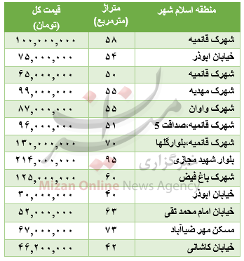قیمت برخی از آپارتمانهای این منطقه به صورت زیر است:
