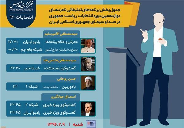 امروز شنبه ۹ اردیبهشت چهار نامزد دوازدهمین دوره انتخابات ریاست جمهوری از طریق رسانه ملی با مردم صحبت میکنند.