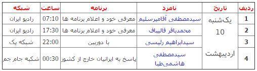 امروز یکشنبه (۱۰اردیبهشت) چهار نامزد دوازدهمین دوره انتخابات ریاست جمهوری از طریق رسانه ملی با مردم صحبت میکنند.به گزازش فارس، امروز یکشنبه 10 اردیبهشت میرسلیم، قالیباف، رئیسی و هاشمیطبا، چهار نامزد دوازدهمین دوره انتخابات ریاست جمهوری از طریق رسانه ملی و در برنامههای جداگانه با مردم صحبت میکنند.