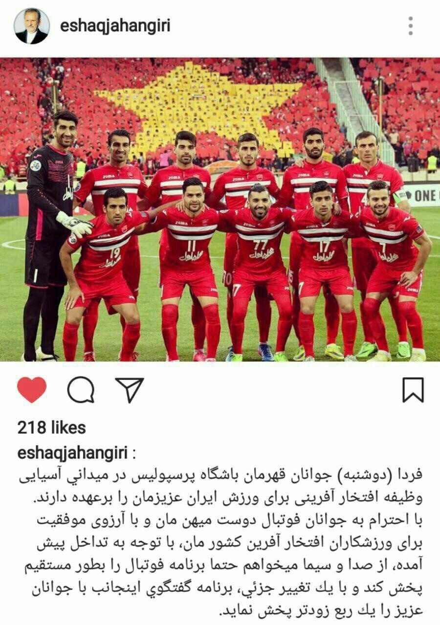 اسحاق جهانگیری از نامزدهای دوره دوازدهم انتخابات ریاست جمهوری در پیامی اینستاگرامی خواستار پخش بازی پرسپولیس از تلویزیون شده است.