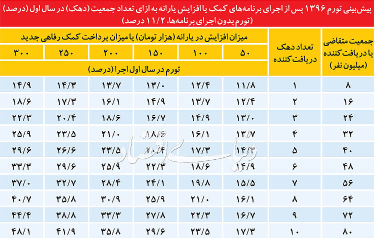 براساس برآورد انجام شده در مركز پژوهشهاي مجلس شوراي اسلامي، نرخ تورم سال جاری برابر2/ 11 درصد خواهد بود. این گزارش نیز بر همین اساس، پيشبيني متغيرهاي اقتصاد كلان را در صورت توزيع واحد پولي مذكور انجام داده است. در این گزارش 4 روش برای جبران کسری بودجه دولت ارائه شده است. شایعترین راه برای تامین مبلغ فوق، دريافت از بانك مركزي خواهد بود؛ درصورتيكه دولت بخواهد اين مبلغ را از محل بانك مركزي جبران کند پايه پولي در سال 96 حدود 27درصد افزايش مییابد. این افزایش به معنی رشد تورم به اندازه 4/ 6درصد در سال جاری خواهد بود. در نتیجه تورم از حدود 2/ 11 درصد به 6/ 17 درصد خواهد رسید. بديهي است با توجه به رشد قابلتوجه پايه پولي و نقدينگي، اثر تورمي با تاخير اين سناريو در سالهاي بعد نيز قابلتوجه است.