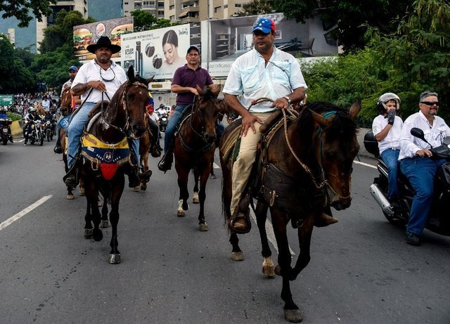 مردم ونزوئلا در اعتراضی دیگر علیه رئیسجمهور کشورشان سوار بر ماشین، موتور سیکلت، دوچرخه و حتی اسب به خیابانها آمدند و جادهها را مسدود کردند و پلیس نیز در مقابل متوسل به شلیک گاز اشکآور شد.
