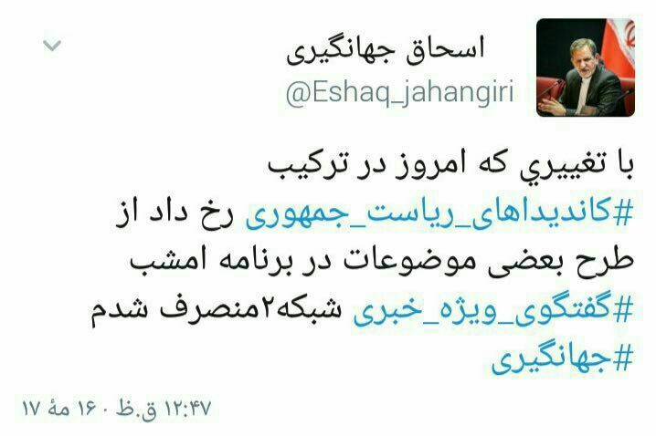 اسحاق جهانگیری: با تغييري كه در تركيب كانديداهای رياست جمهوری رخ داد از طرح بعضی موضوعات در برنامه گفتگوی ویژه خبری شبکه 2 منصرف شدم