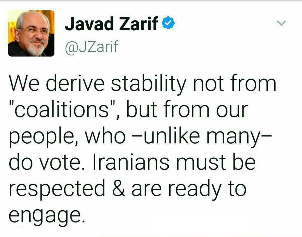 ما ثبات خود را نه از "ائتلاف ها" بلکه از مردم خود می گیریم که - بر خلاف برخی- رأی می دهند. باید با ایرانیان که آماده تعاملاند، با احترام رفتار کرد