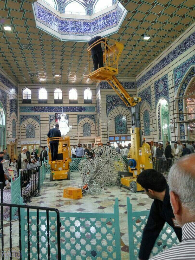 پیش از ظهر امروز چلچراغ حرم حضرت معصومه(ع) هنگام غبارروبی سقوط کرد که خوشبختانه صدمات جانی نداشت.