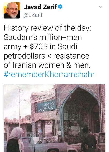 وزیر امور خارجه کشورمان در توئیتی بمناسبت سوم خرداد، ارتش میلیونی صدام را کوچکتر از مقاومت ایرانیان بیان کرد.