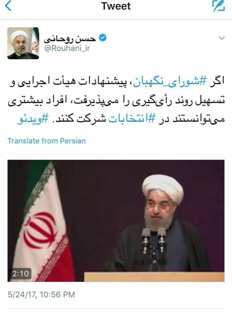 حسن روحانی در صفحه توئیتر خود از رد پیشنهادات هیأت اجرایی برای تسهیل روند رأیگیری توسط شورای نگهبان انتقاد کرد.