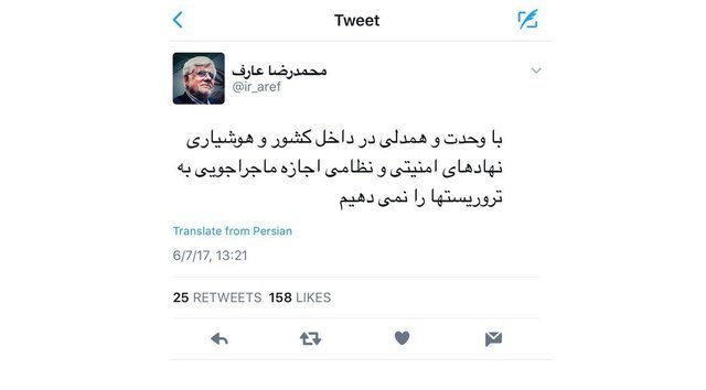به گزارش ایسنا، محمدرضا عارف در توئیتری در واکنش به حادثه تیراندازی امروز مجلس گفت: با وحدت و همدلی در داخل کشور و هوشیاری نهادهای امنیتی و نظامی اجازه ماجراجویی به تروریست‌ها را نمی‌دهیم.