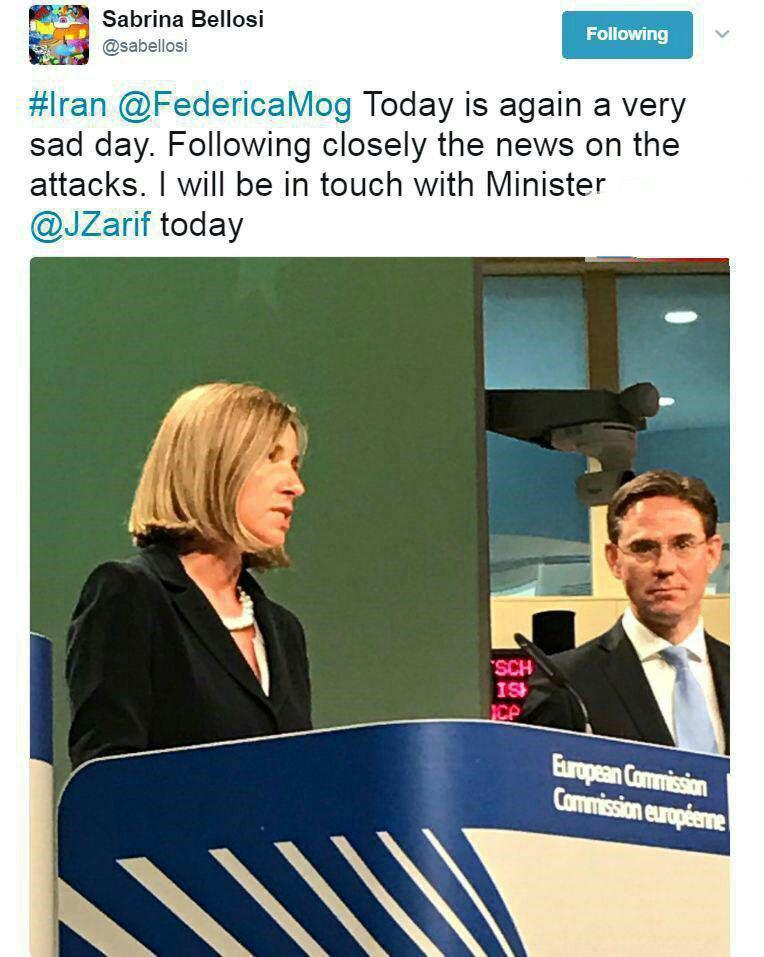 به گزارش تسنیم، فدریکا موگرینی مسئول سیاست خارجی اتحادیه اروپا در واکنش به حوادث تروریستی امروز در تهران گفته است امروز روز بسیار غمگینی است. اخبار حملات را از نزدیک پیگیری میکنم. امروز با محمد جواد ظریف وزیر خارجه ایران در تماس خواهم بود.