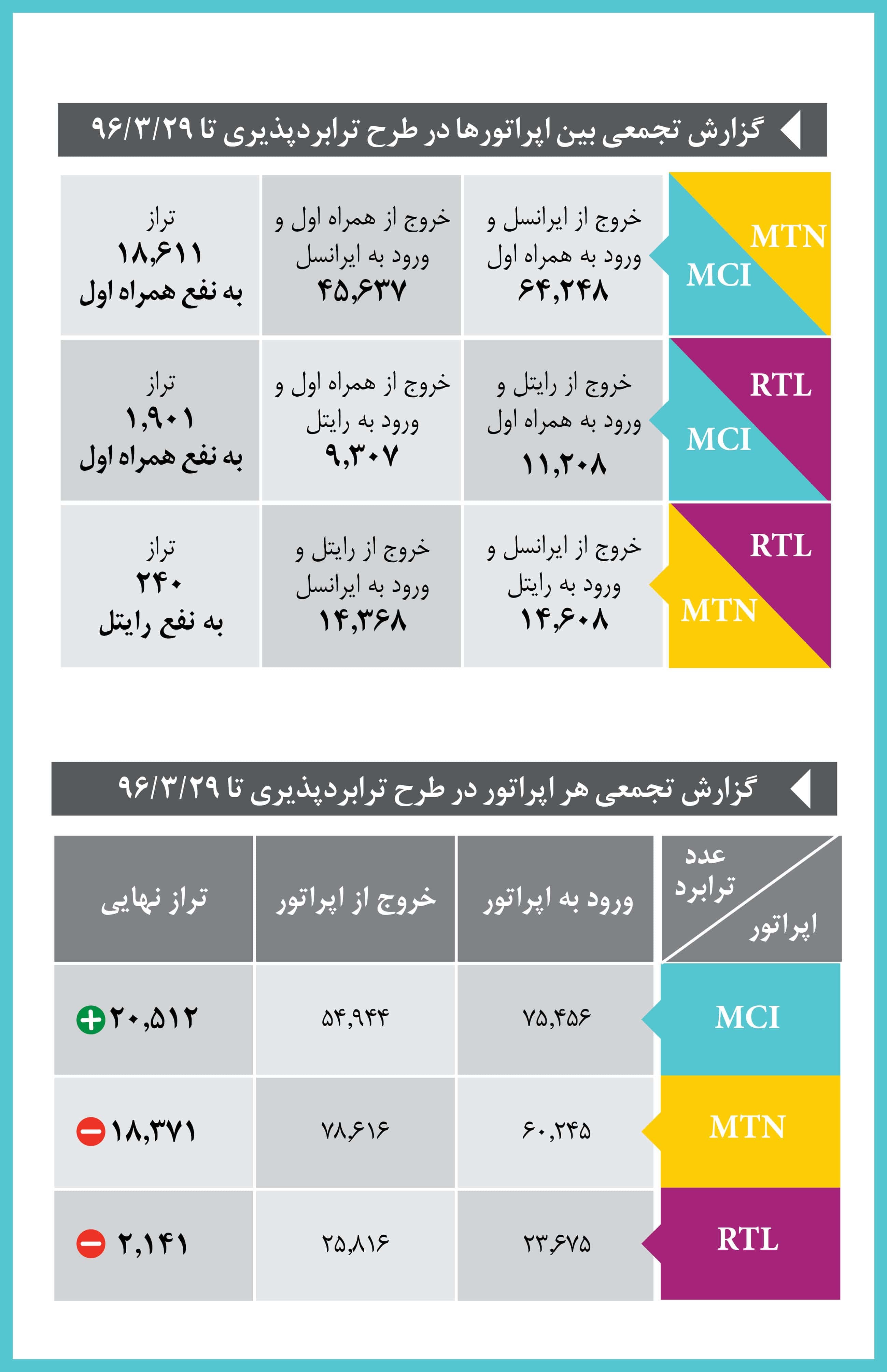 بر اساس این گزارش، همراه اول تاکنون ۱۸۶۱۱ مشترک بیش از ایرانسل و ۱۹۰۱ مشترک بیش از رایتل از این دو اپراتور در فرایند ترابرد جذب کرده است.