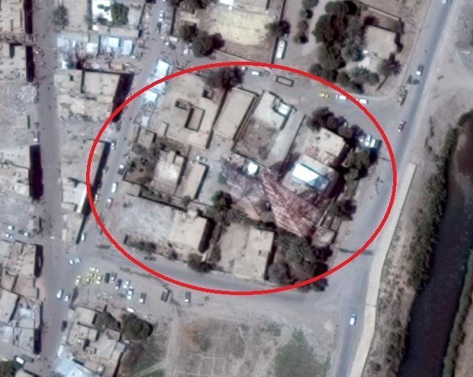 مقر فرماندهی - مخابراتی داعش در شهر المیادین - به دکل‌ها دقت کنید (بالا)