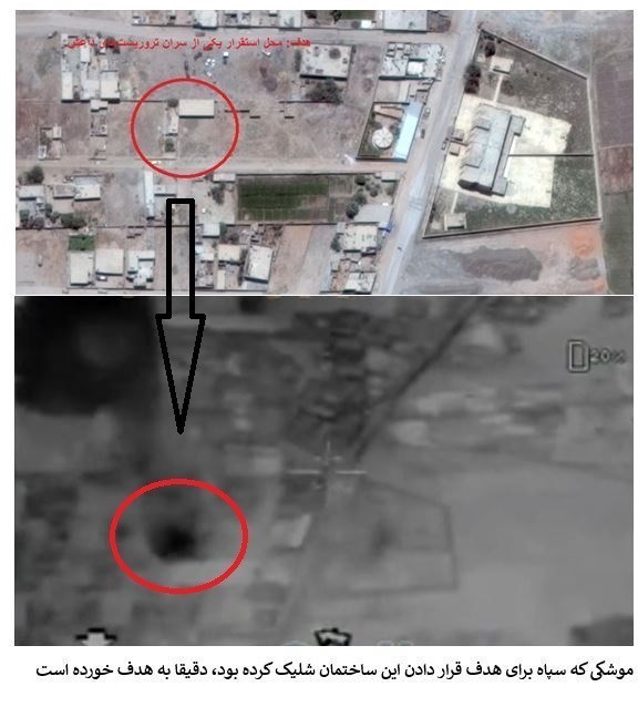 از این رو، ساختمانی کوچک و یک طبقه (احتمالا محل استراحت شبانه)، محل استقرار یکی از فرماندهان داعش در جنوب غرب المیادین بوده و سپاه نیز، همان ساختمان را هدف قرار داده و فیلم منتشره هم موید این موضوع است که موشک دقیقا به هدف اصابت کرده است.