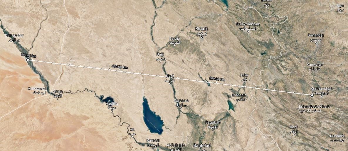 فاصله حومه کرمانشاه تا این مقر فرماندهی داعش در شهر المیادین در استان دیرالزور سوریه، بیش از 580 کیلومتر است. در تصویر ذیل این فاصله به طور تخمینی نشان داده شده است.