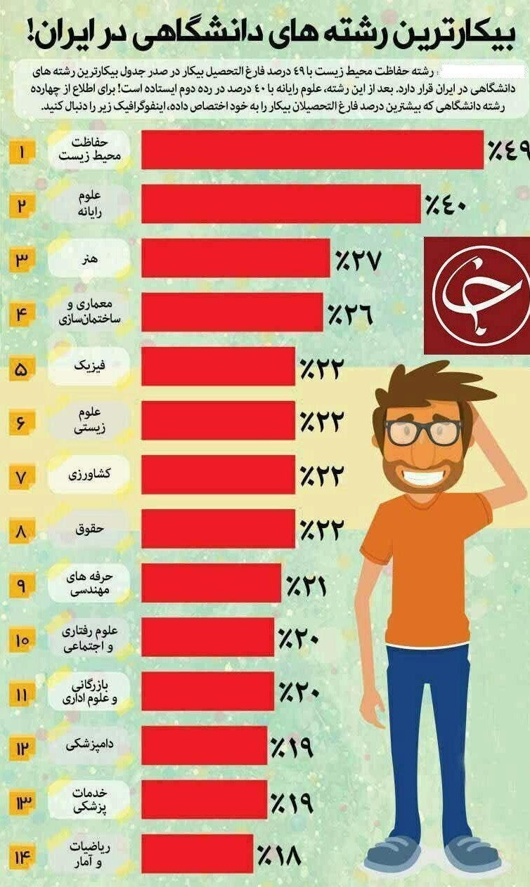 رشته حفاظت محیط زیست با 49 درصد، رشته علوم رایانه با 40درصد، رشته هنر با 27درصد، معماری و ساختمان سازی با 26درصد، رشته فیزیک با 22درصد، رشته علوم زیستی 22درصد، رشته کشاورزی 22درصد، رشته حقوق 22درصد، حرفه های مهندسی 21درصد، علوم اجتماعی و رفتاری 20درصد، بازرگانی و علوم اجتماعی 20درصد، دامپزشکی19درصد، خدمات پزشکی 19درصد، ریاضیات و آمار18درصد به ترتیب بیکارترین رشته های دانشگاهی در ایران است.